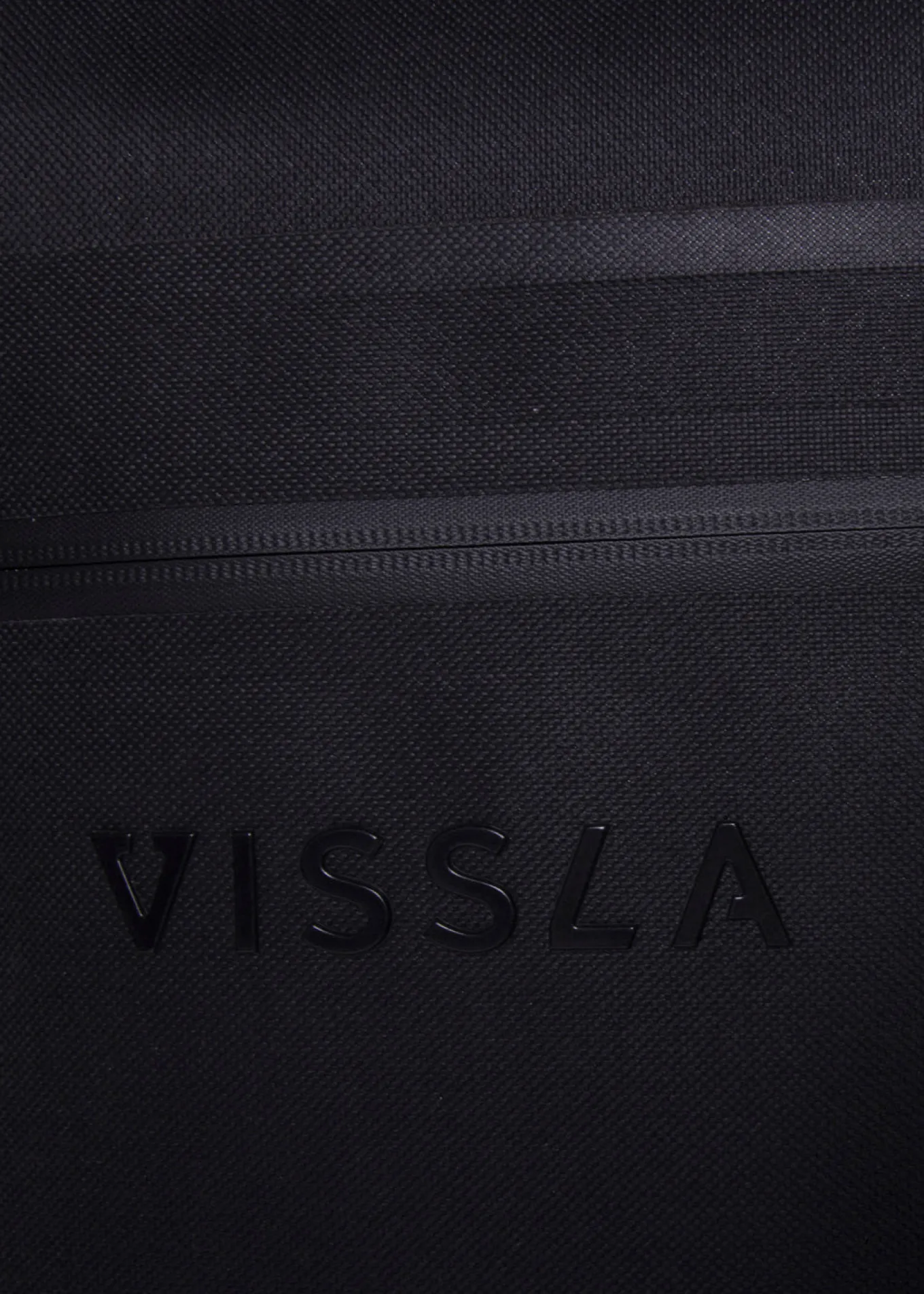 Sleek black dry backpack. The North Seas 18L is constructed with durable polyvinyl front and back panels, 600D PU coated side panels with full welded seams. Design includes water resistant front pocket and mesh side pockets. Top of bag is designed to roll shut and clip secure with nylon buckle to keep contents dry. Backpack features Vissla’s Air Crossover padded back to keep moisture away from your back. 30x18x73cm
