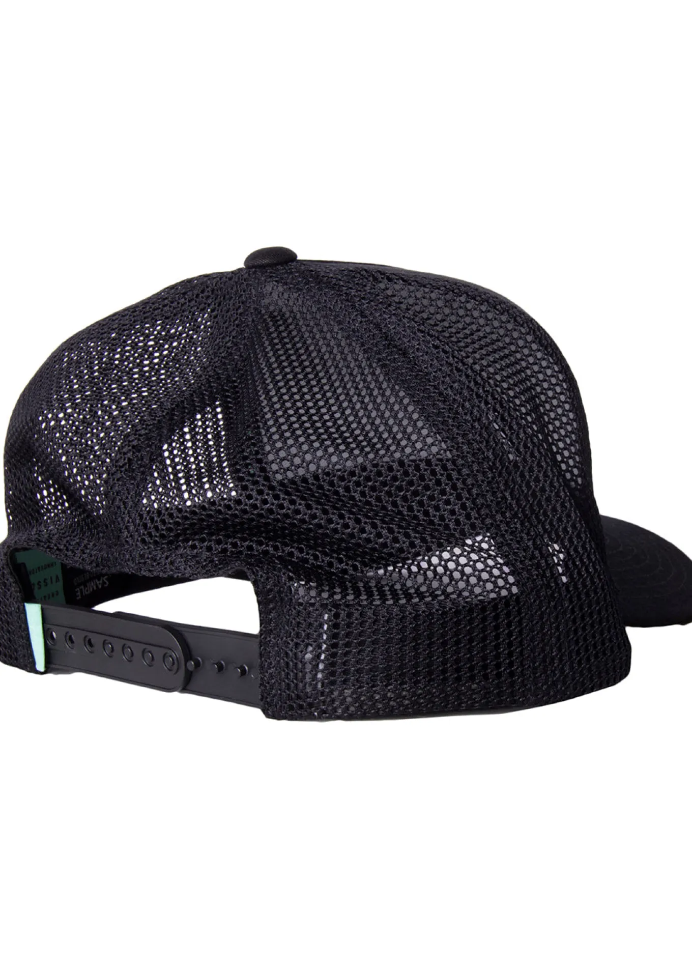 Classic 5 panel trucker hat with recycled mesh and adjustable snap back closure. Details include embroidered patch, custom interior taping, and flag label at back.