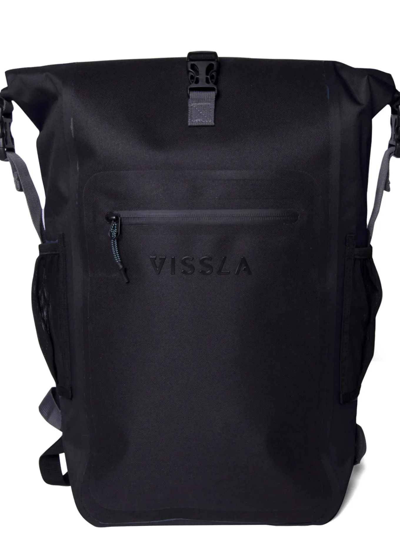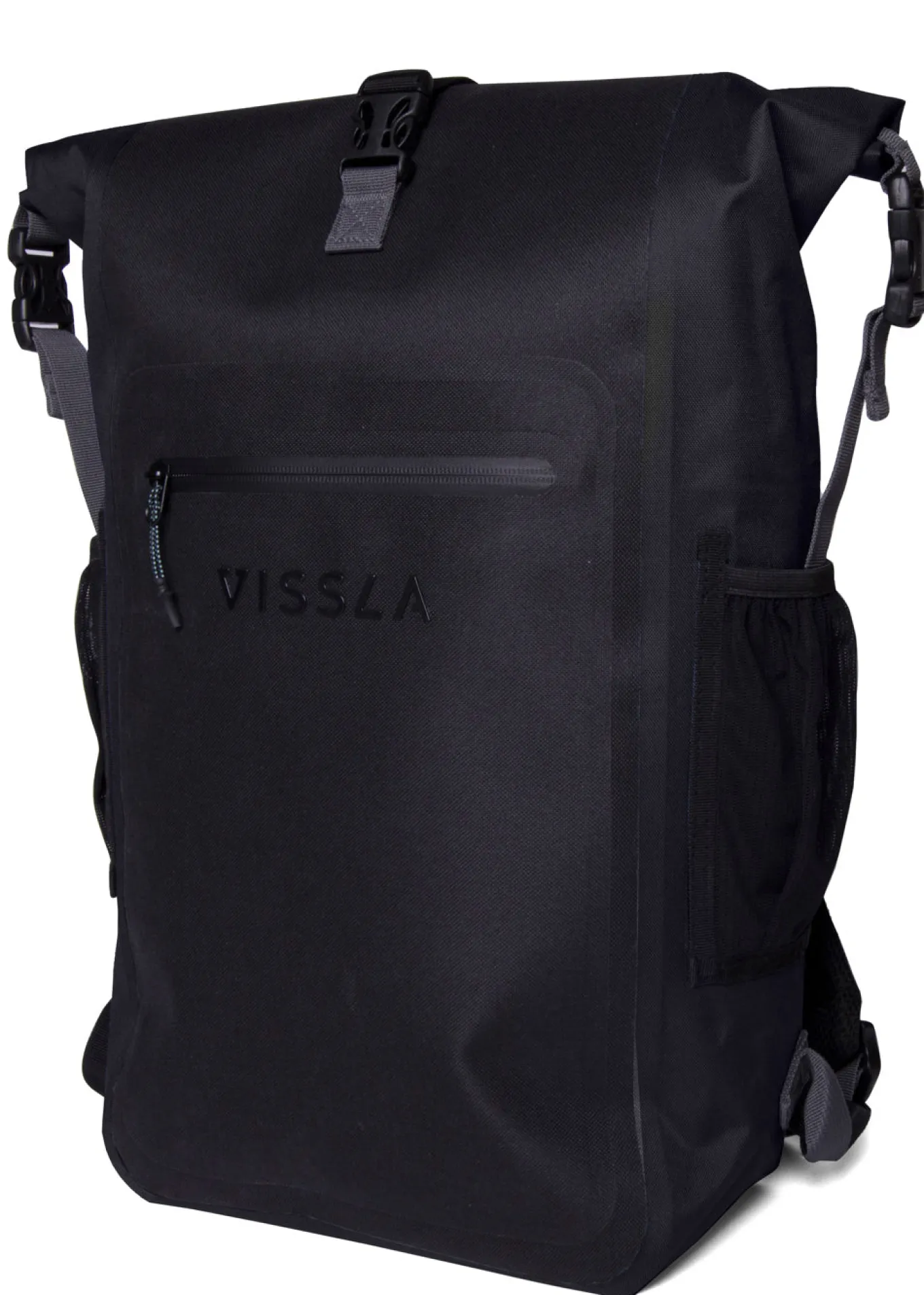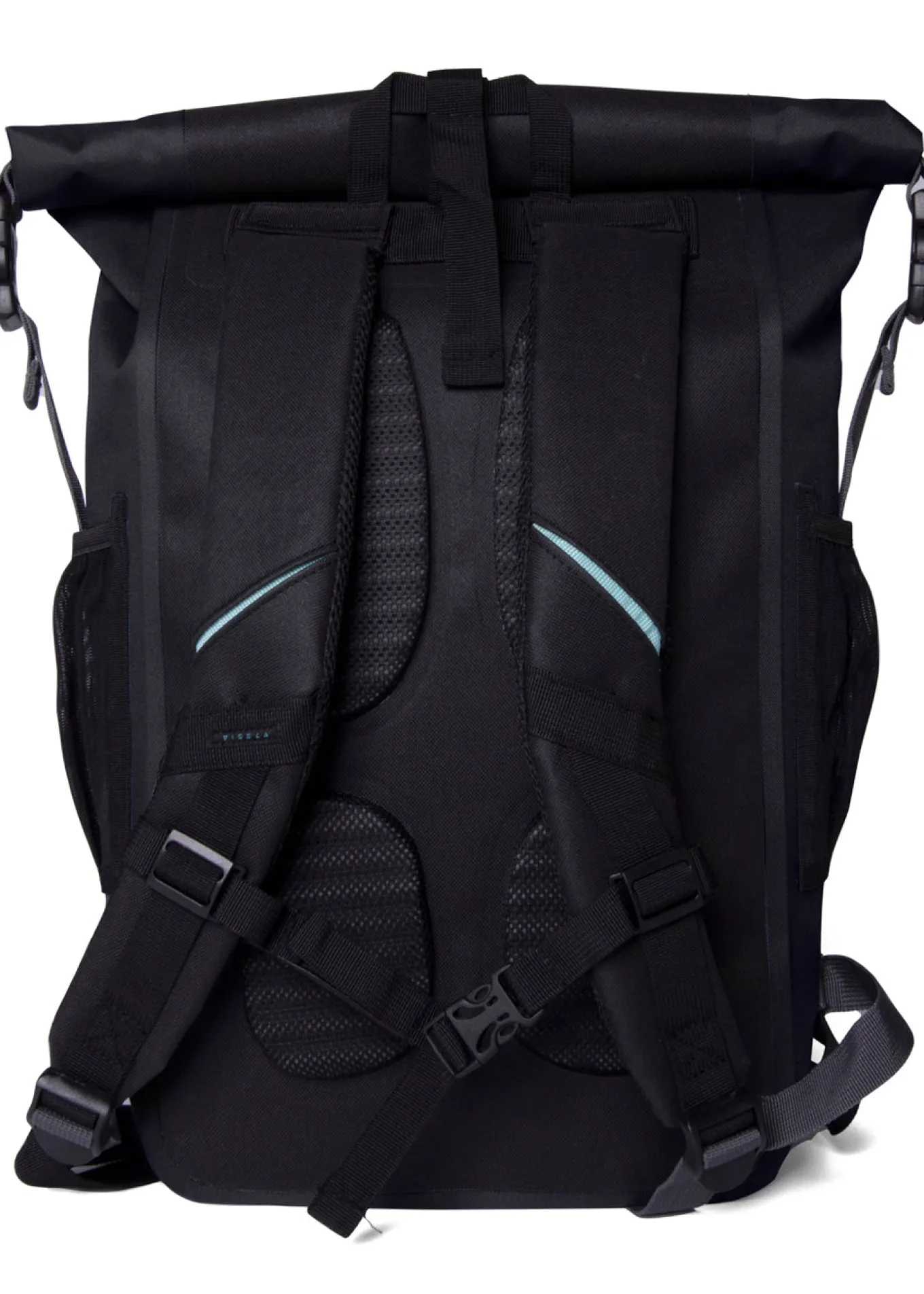 Sleek black dry backpack. The North Seas 18L is constructed with durable polyvinyl front and back panels, 600D PU coated side panels with full welded seams. Design includes water resistant front pocket and mesh side pockets. Top of bag is designed to roll shut and clip secure with nylon buckle to keep contents dry. Backpack features Vissla’s Air Crossover padded back to keep moisture away from your back. 30x18x73cm